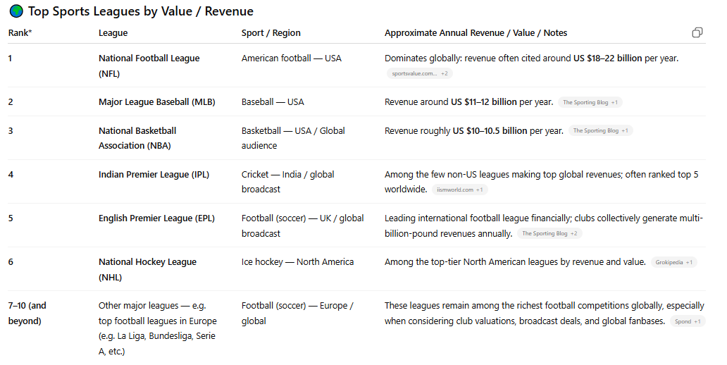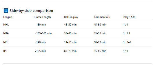 They all share a very high advertisement to actual action ratio. For my European and American readers, cricket has copious opportunity for advertisements - ever 6 balls, we see a change in bowler which takes at least a minute. Every wicket (change of batter) gives a chance for an ad break and takes at least minute, and the IPL also added in time outs as well to offer more chances for commercial breaks. The NFL is the most valuable league not because it is the most popular, but because it can sell the most commercials.