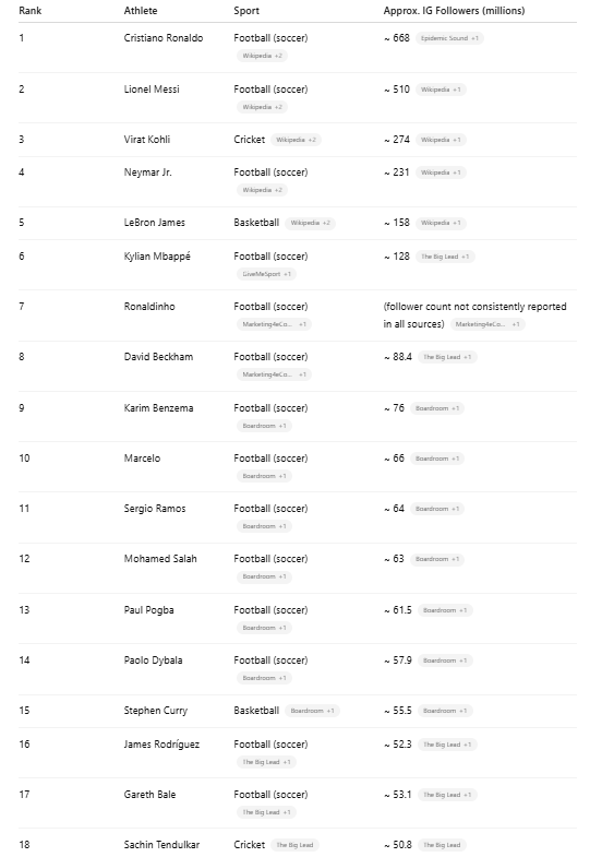 The NFL probably benefits from the lack of actually playing time in its games. It is noteworthy that very few NFL players have high number of Instagram followers. The problem for NFL players is that wearing a helmet all the time means the average punter in the street (or on Instagram) does not recognise them. This probably adds to the value of the NFL league, as players have less negotiating power. Football, basketball and cricket seems to allow its players greater connection to fans.