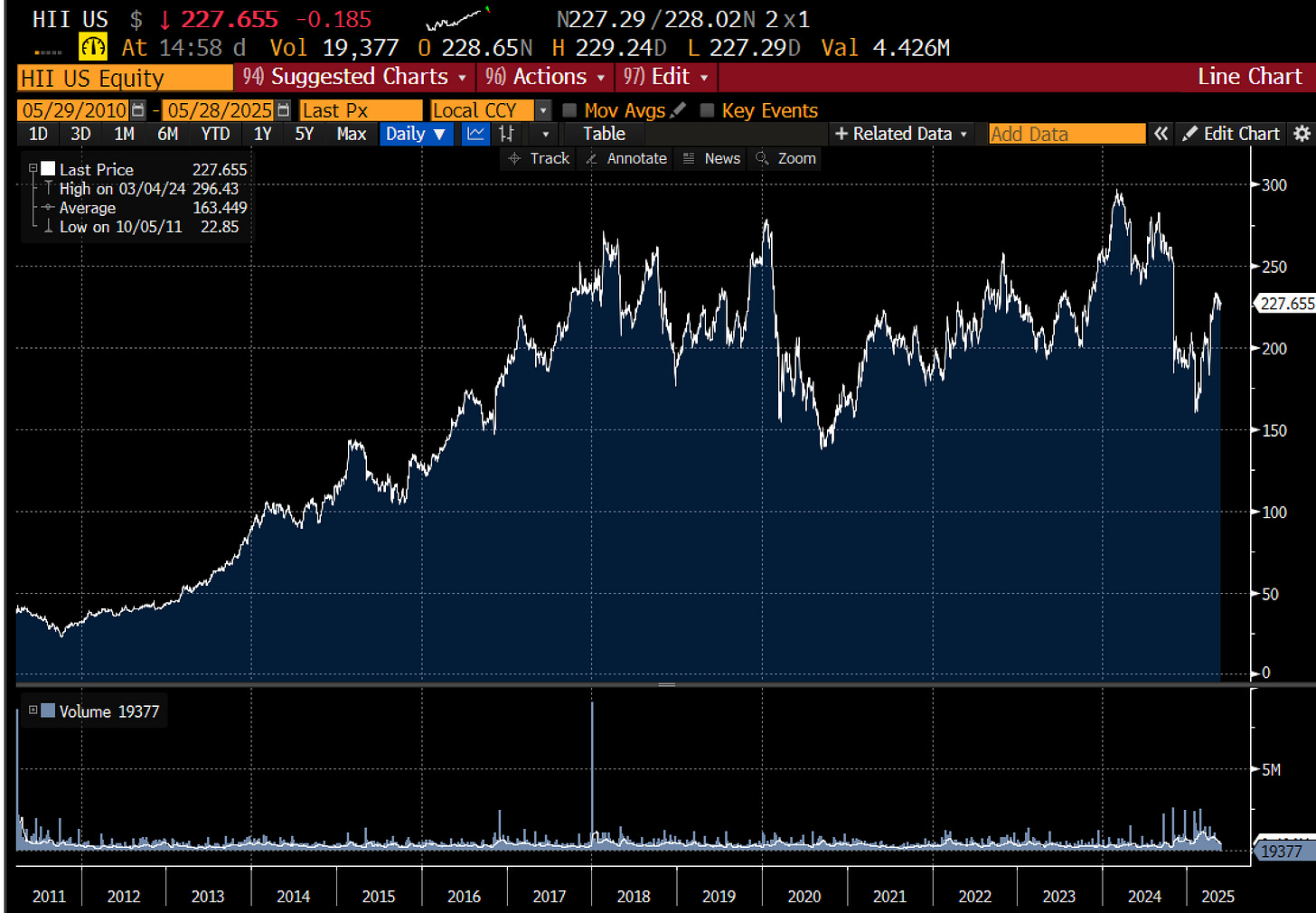However, not all my defence stocks have moved. I thought the US would embark on a massive ship building program to try and offset Chinese superiority here. There is only one listed company that builds US navy ships - Huntington Ingalls Industries (HII US). It is also the largest navy shipbuilder. If US suddenly increases shipbuilding orders, this would be the only way to play it. The stock has been a big nothing burger for 10 years. Part of the problem has been margins which have been squeezed (one reason I could not chase Rheinmetall, as you are assuming margins remains good - which is not always the case with military orders).