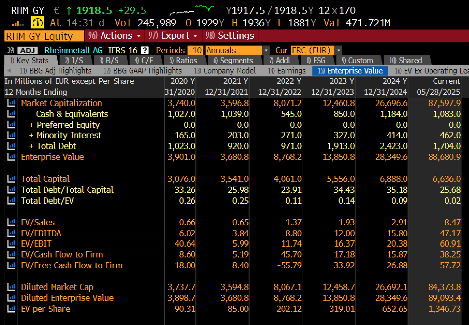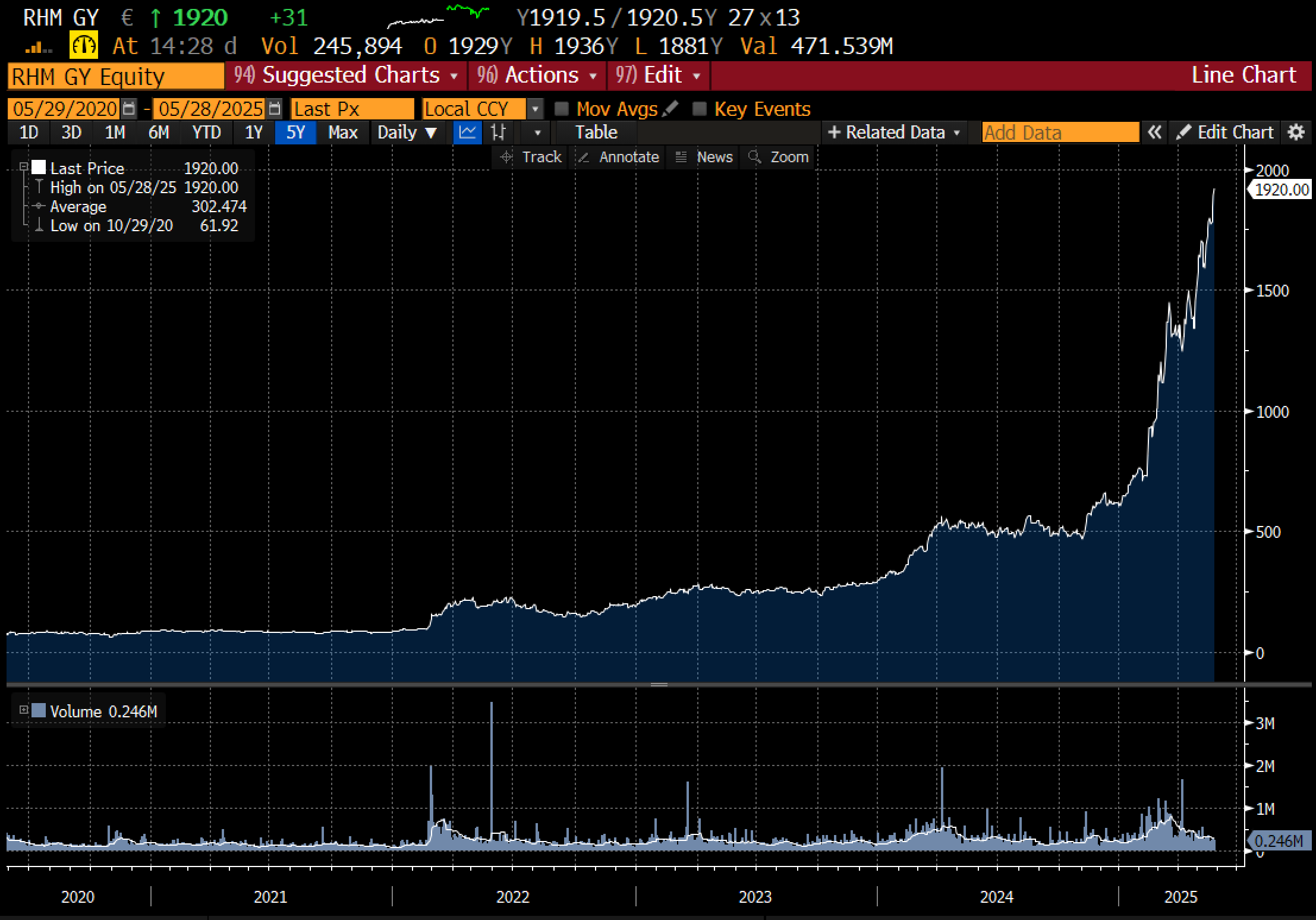 Even though I am known for short selling, like everyone else in fund management, I have made more money from longs than shorts (its just the nature of the beast). Before I closed my fund in 2022, I did quite like defence as a long theme, and this area has really moved. One stock I owned was Rheinmetall (RHM GY). At the time its defence business was loss making, and its auto business was struggling. It was trading at around book, which to me was amazing. Defence business very rarely trade that cheap. We doubled our money in it, and then in 2021 I closed down the fund and we exited the position. It has continued to trade well, as it has become THE European defence stock.