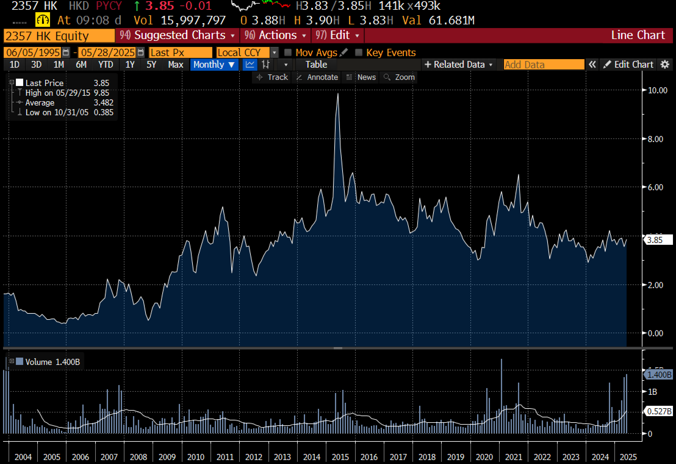 Another issue is whether ship building is a dead option in a world with drone warfare? I don’t know the answer here, but it is one of the few defence stocks I would define as cheap. Another one is a Chinese one, AviChina. This was one of the first stocks I bought with my first fund at 0.50HKD entry price in 2006 (I did mention I made more money being long). It has been worse than dead money since 2015. Its an unusual stock as most of the value lies in China mainland listed companies. One of its listed subsidiaries built the Chinese fighter that apparently shot down a Rafale jet in the recent India-Pakistan encounter. There are risks to owning this stock - mainly sanctions - but it looks interesting to me for investors that can handle that risk.