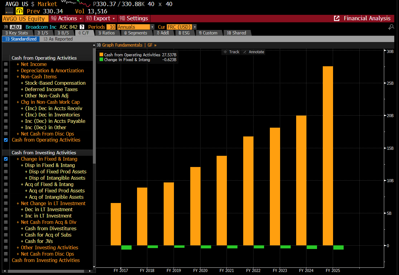 Broadcom has kept capex at a ridiculously low level, even as operating cashflow surged.