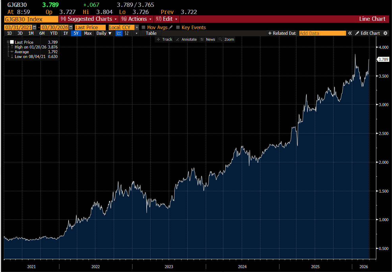 From an investing perspective, this makes things tricky. The short term outlook gets messier and messier, but the long term outlook gets better and better. No matter what happens, the energy market will become more stable. If Iran capitulates, then the region becomes safer. If Iran does not, then more and more energy production will move to politically stable regions like the US or Australia. But what the War in Iran does do, it accelerate the trends that were already clearly visible - a rising cost of capital. 30 Year JGBs have resumed their sell off, with yields back to near highs.