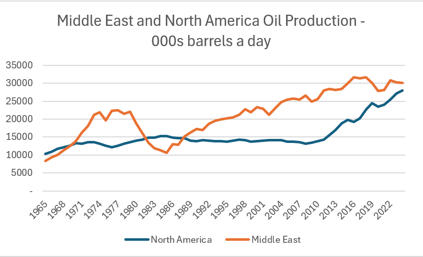 Of course Iran survived because it threatened all Middle Eastern oil and gas production. But with surging US production, it has been losing market share. North America is nearly a larger producer than all of the Middle East.