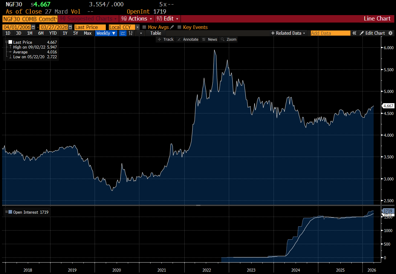 What is extremely problematic for Iran is that surging oil prices only affect nations that are diplomatic allies of a sort (Europe and Asia would prefer a peaceful resolution). At least the Russians use of the energy weapon was directed at the nations funding Ukraine. The Iranian energy weapon can only cause collateral damage. In fact, by drawing in other regional players, it makes the Iranian endgame of regime change even more likely. If they cannot be relied on to keep the oil flowing, the Saudi and other nations will also come to see the need for regime change. Generally speaking the markets are saying the same. When I look at long dated US natural gas futures (January 2030 in this case), you can see when the Russians turned off the gas in 2022, but you struggle to see the closing of the Strait of Hormuz in this price graph.