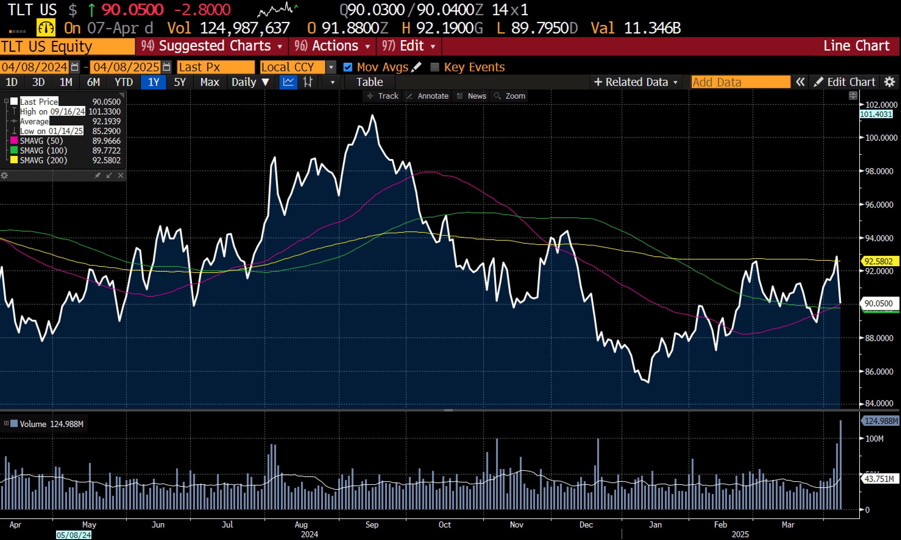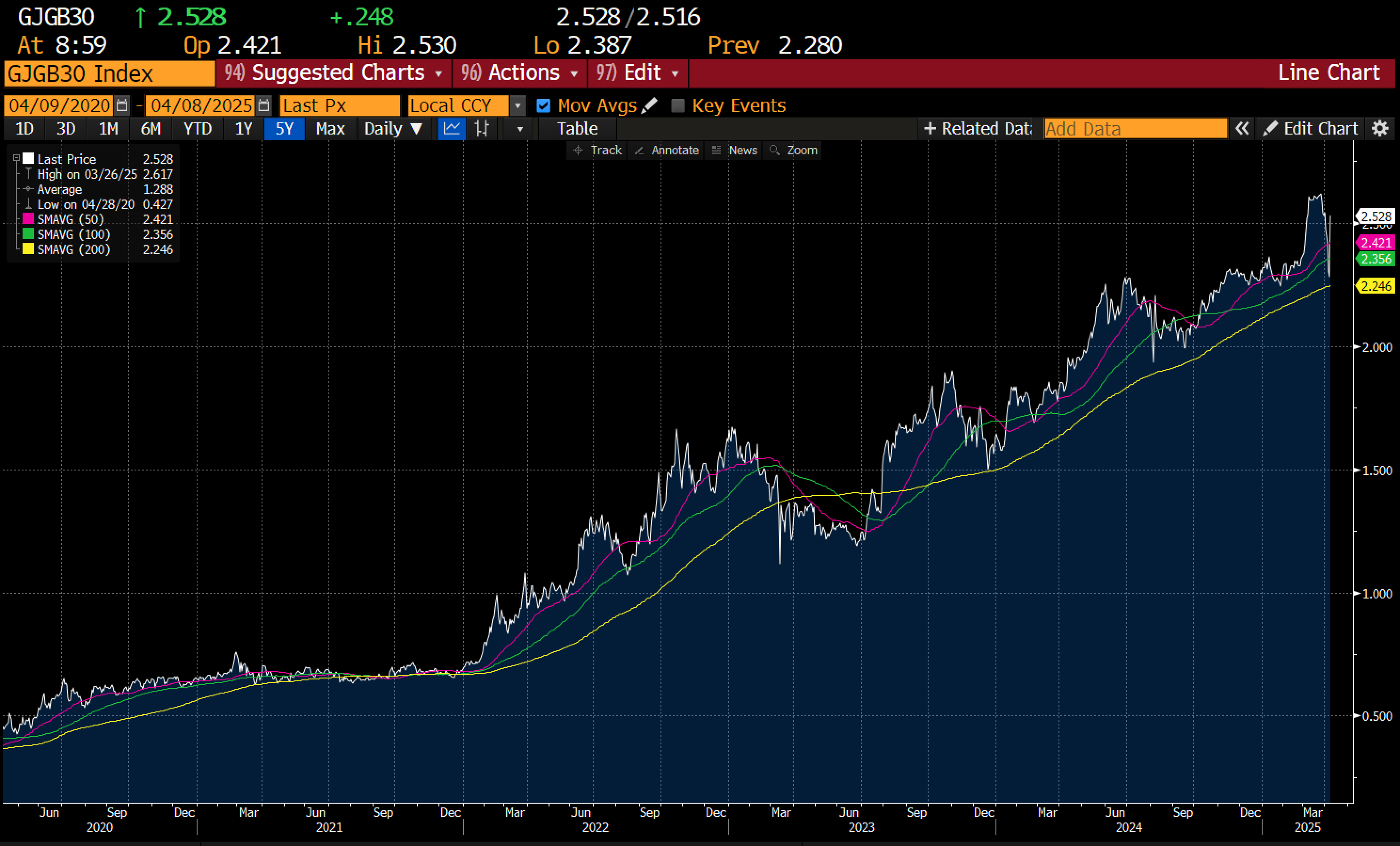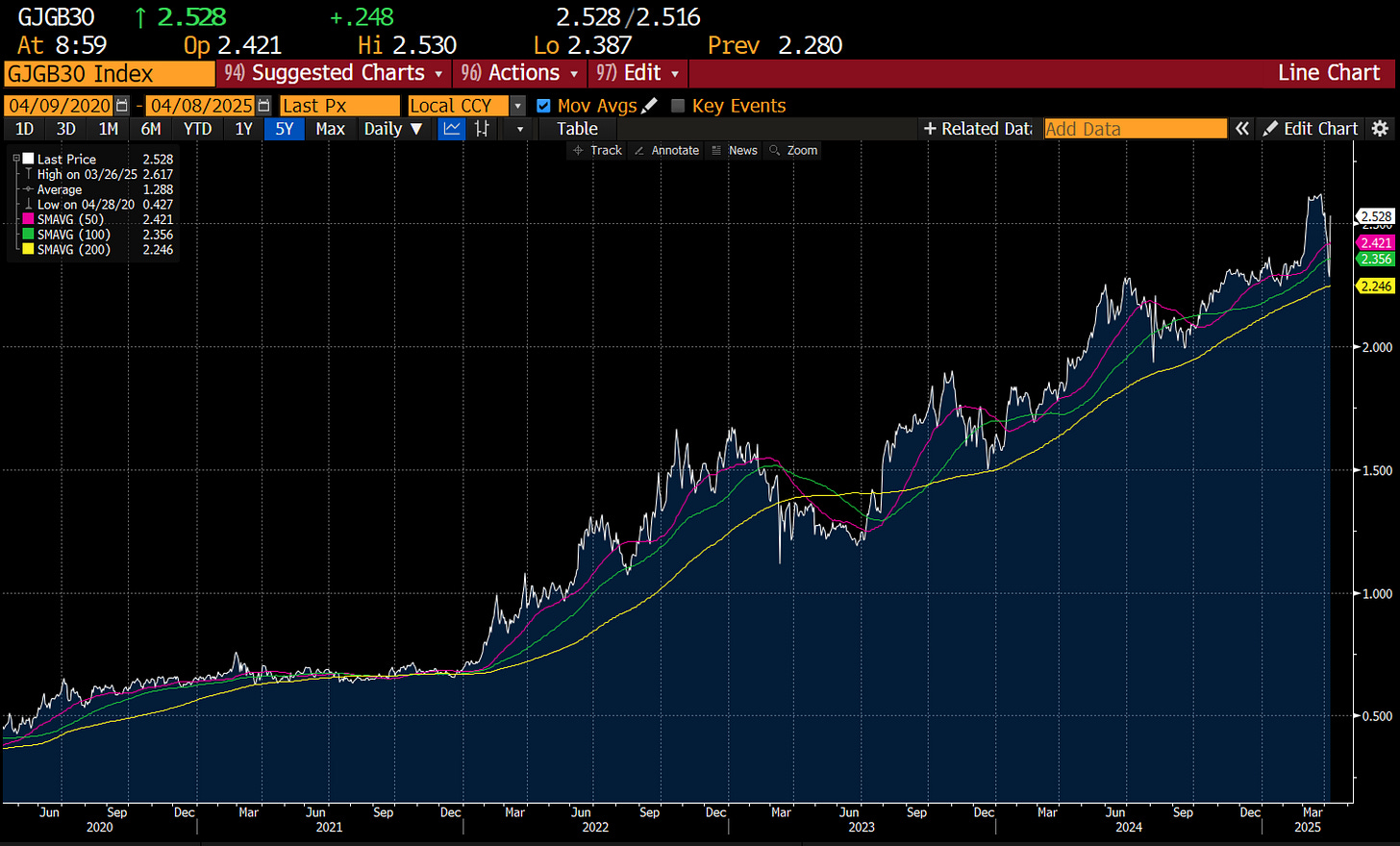 As I have often stated, I might get worried about a short TLT trade if JGBs reverted to a deflationary/falling yield trend. But my reading is that Trump and his “beautiful” tariffs is going to force every government to spend and stimulate - that is be inflationary. The JGB market also does not tell you deflation is imminent. In fact, the huge rally in the last two days has almost totally reversed.