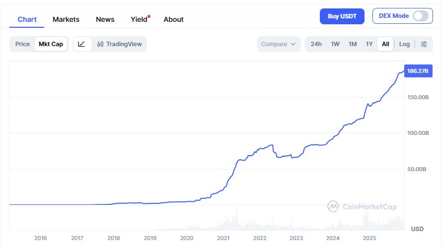 In essence, what I am saying is that the structure of Bitcoin until recently only allowed inflows. Previous volatility in Bitcoin probably came from leveraged players getting margin calls, but now volatility in Bitcoin comes from normal two way markets. For me, I generally look at the market capitalisation of Tether to get an idea of liquidity in the crypto space. This continues to rise.