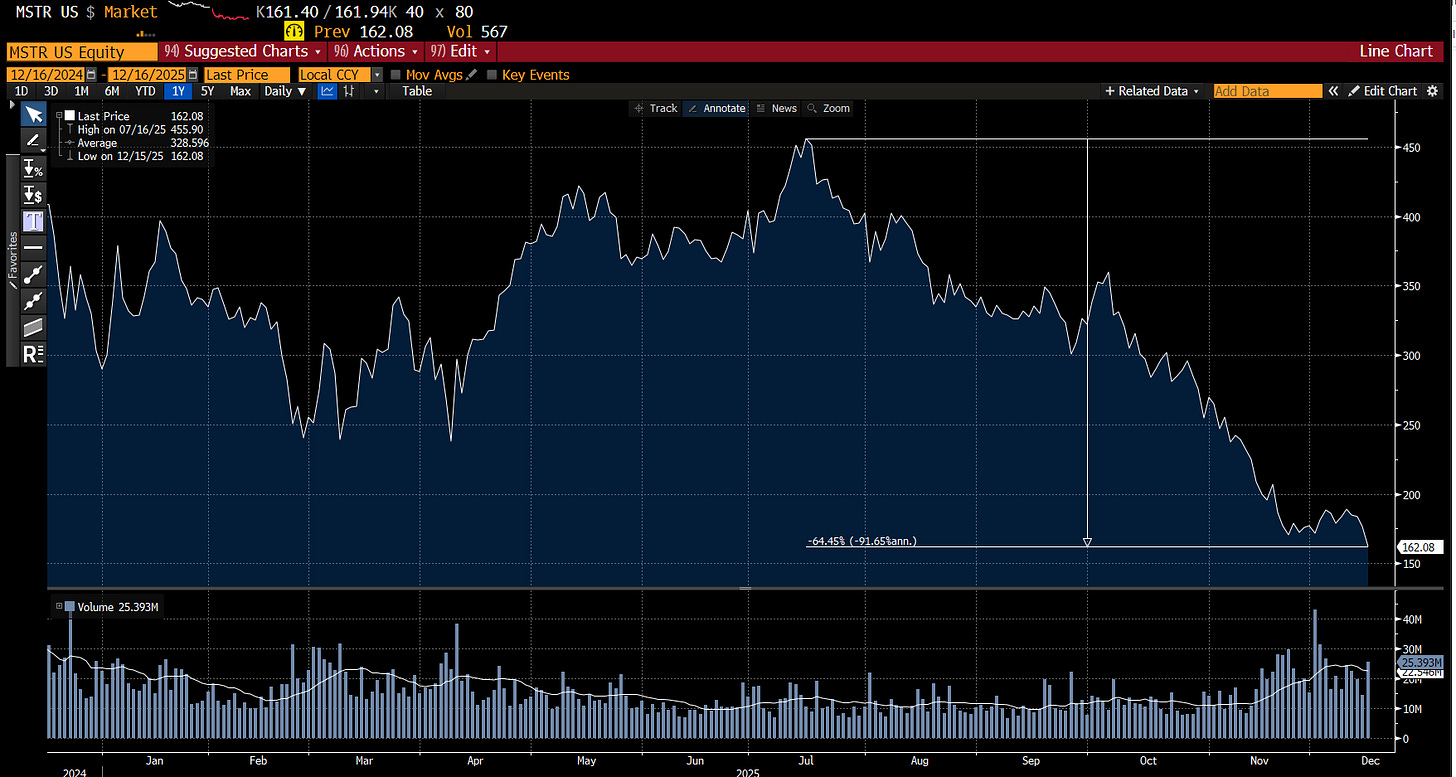Unfortunately, with relatively little short interest, Strategy now trades below NAV, making issuing shares to buy Bitcoin a value destructive trade. Or in a weird way, bullishness has reduced demand for Bitcoin.