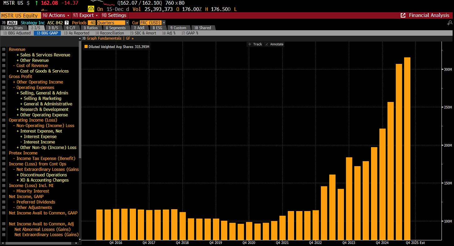 What that meant in practice was that Strategy would trade at a premium to its NAV, and was incentivised to issue shares to buy more Bitcoin. This is something that Michael Saylor did with gusto. Shares outstanding rose from less than 100m in 2020 to over 300m today.