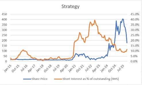 The bullishness that President Trump created for Bitcoin in some ways has created problems for Bitcoin. For years the market has tended to be very bearish on Bitcoin. If we look at the short interest of Strategy (previously Microstrategy), it used to be 35% of shares outstanding. As explained previously, when a share is shorted, it creates huge illiquidity in the underlying, as the owner of the share cannot sell until it is recalled, and the short seller can only buy.