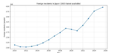 This has been coupled with a near doubling in the number of foreign residents in Japan since 2010.