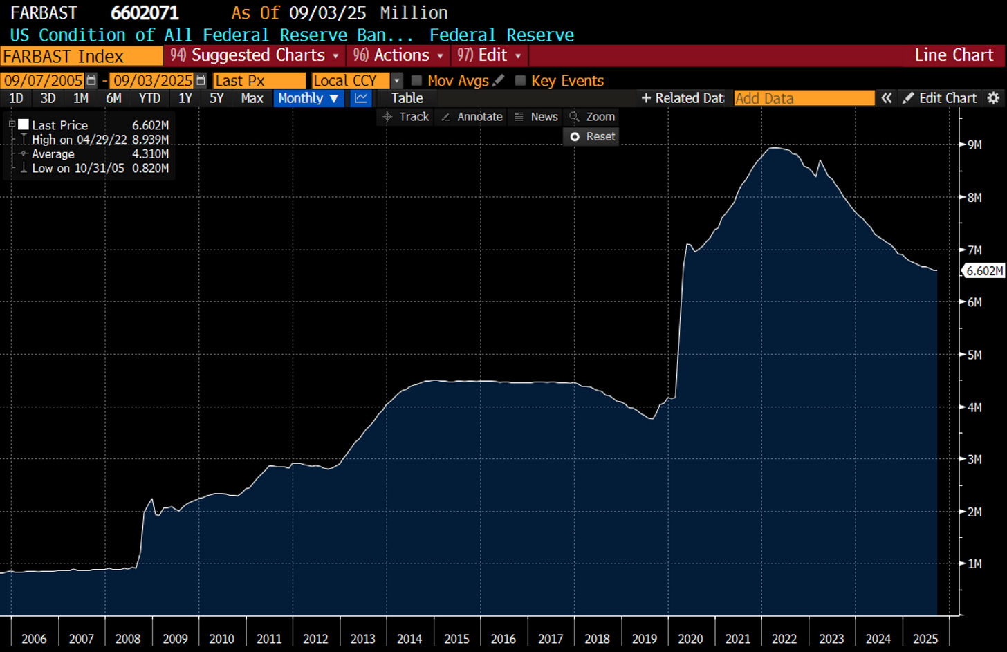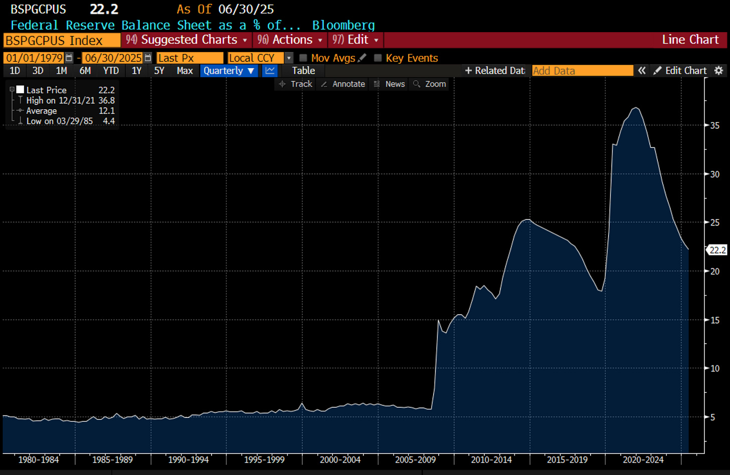 As a percentage of GDP the balance sheet is down from a high of 36% to 22% today. But prior to 2008 it was only 7% of GDP. With US GDP at USD 30 trillion, 7% would imply a USD 2.1 trillion balance sheet, or a USD 4.5 trillion reduction.
