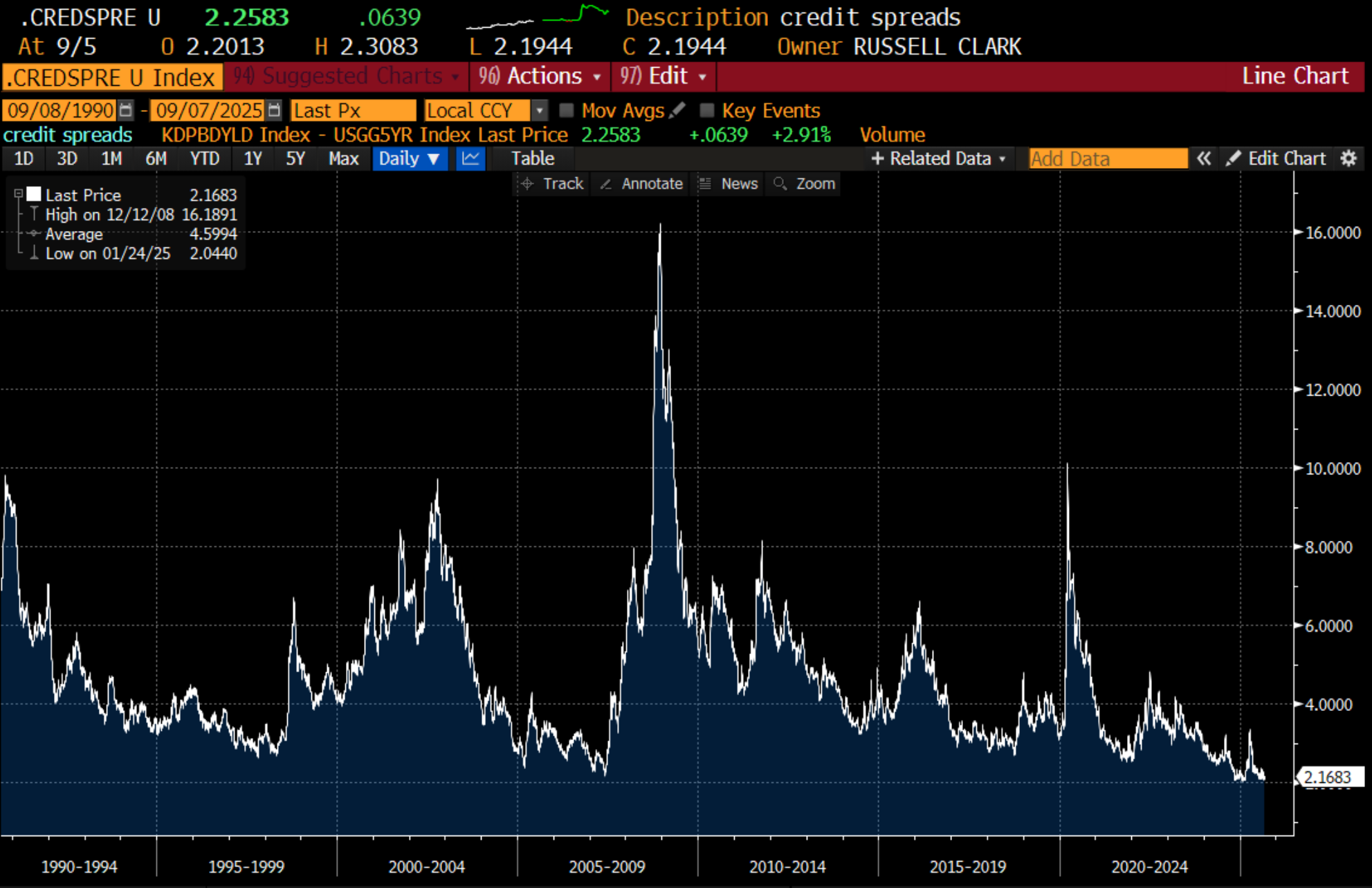 It is particularly noticeable that since Covid, (and really from 2016 onwards) the spread on corporate debt to treasuries has become low and stayed low (COVID aside).