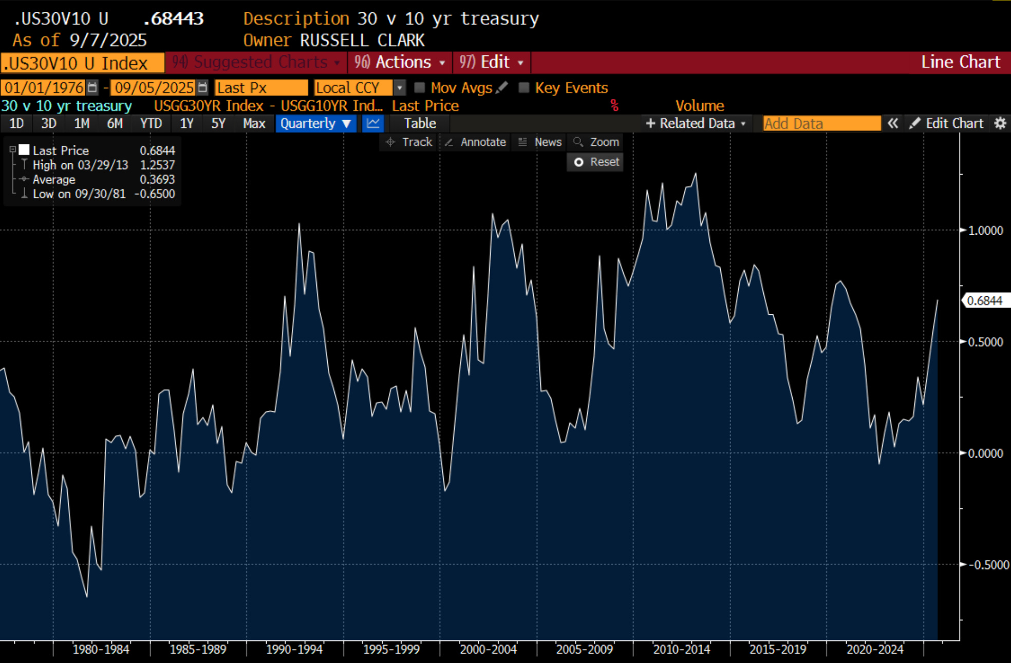 My preferred inflation measure, the 30 year yield to the 10 year yield, has also surged to new highs. That is market seeing yields lower in the short term, but needing to be higher in the long term.