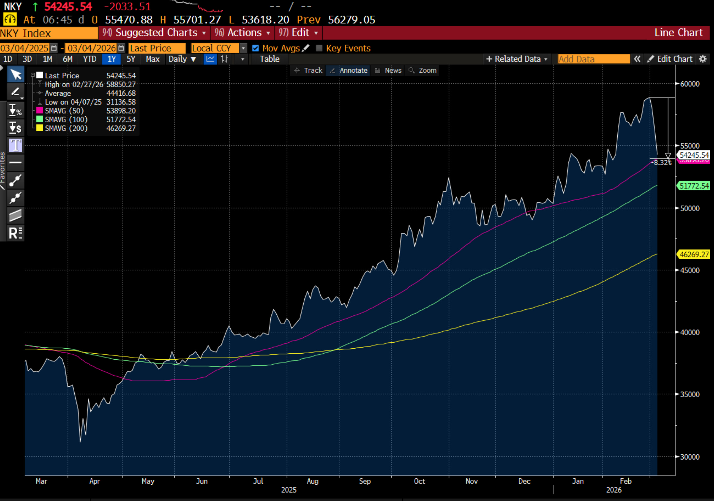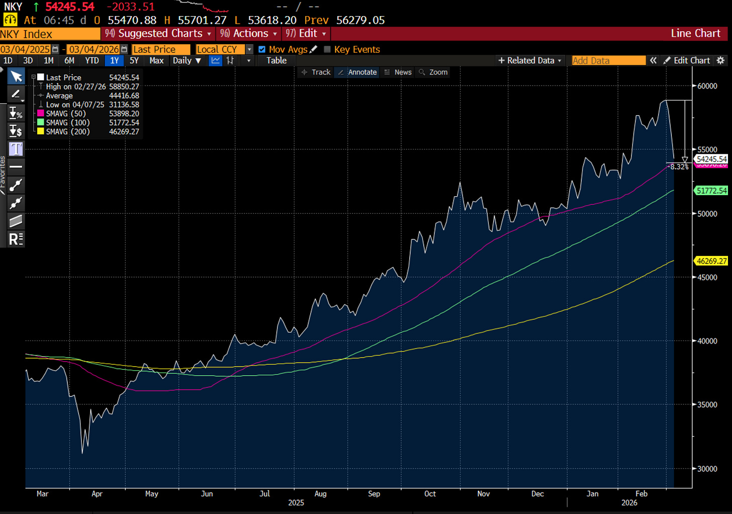 Japan and Korea have been by far the weakest markets since the war in Iran started. Nikkei is down 8% this month - but as any day trader or amateur market technician would tell you, so far not even a correction in an uptrend.
