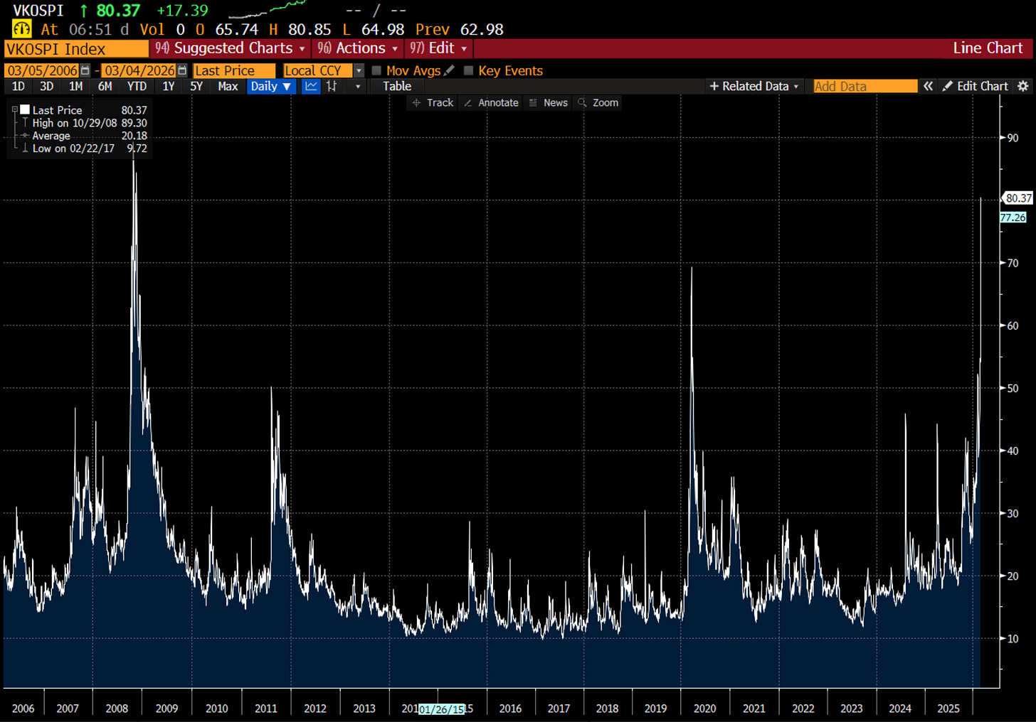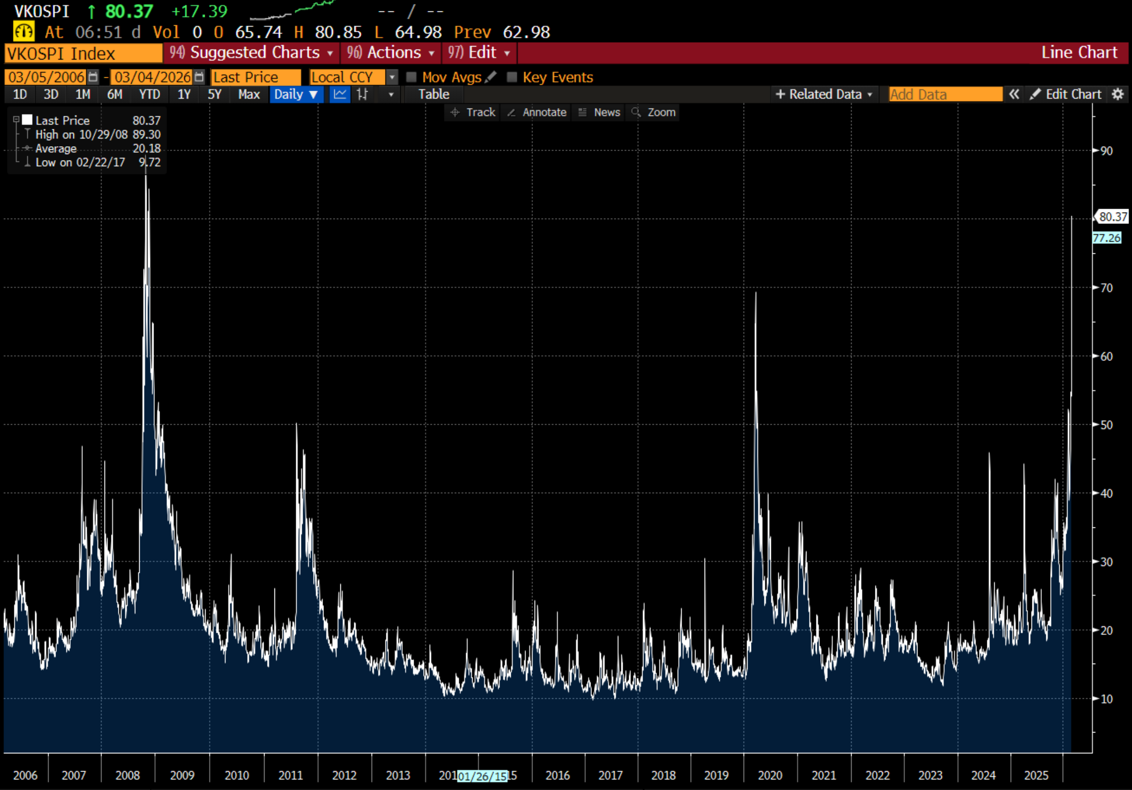 Kospi VIX is now at 80, which is a level ABOVE Covid shock levels, and in line with GFC levels. No doubt some issues with autocallables are at play here, but that is a very elevated level.