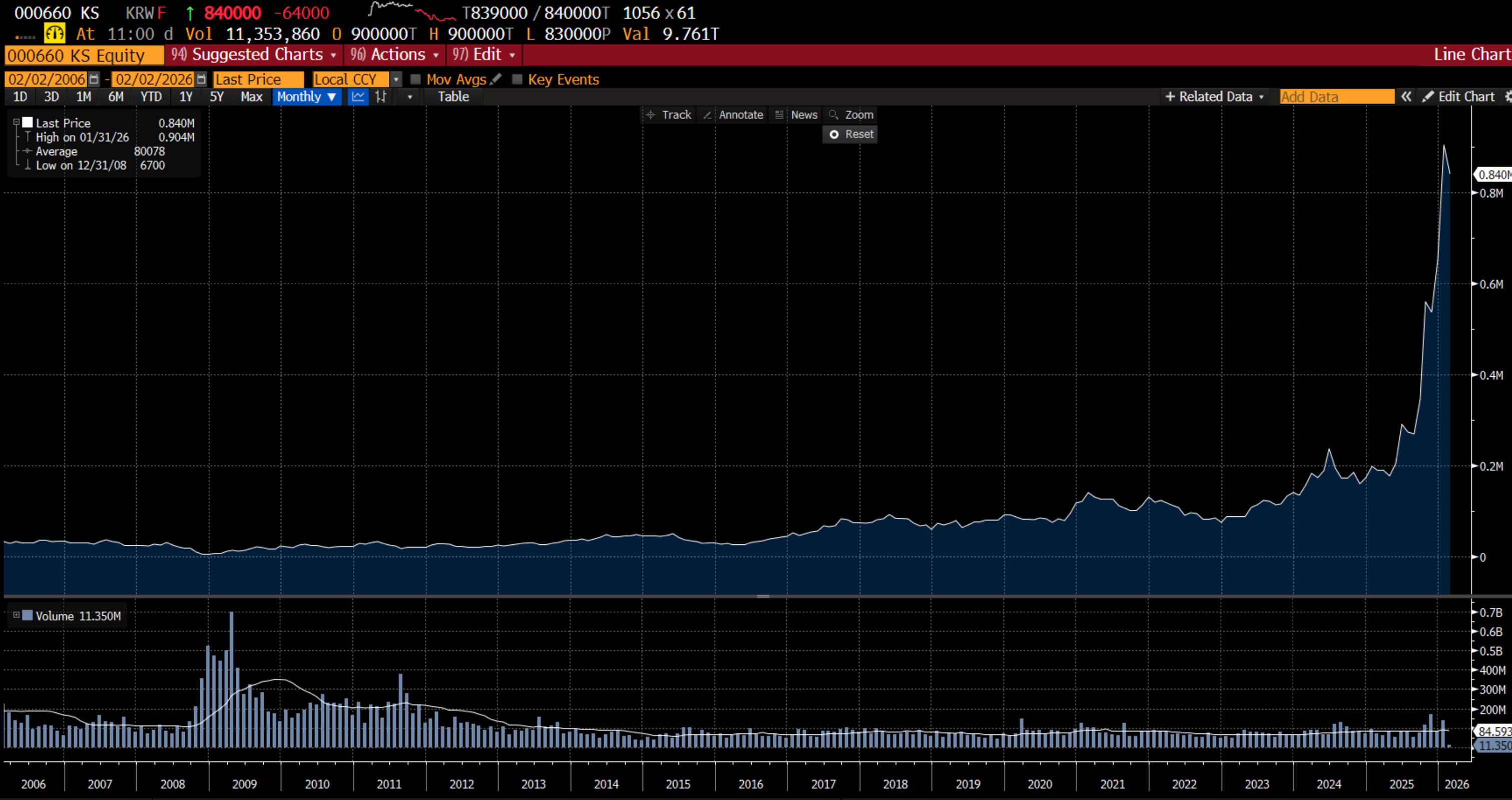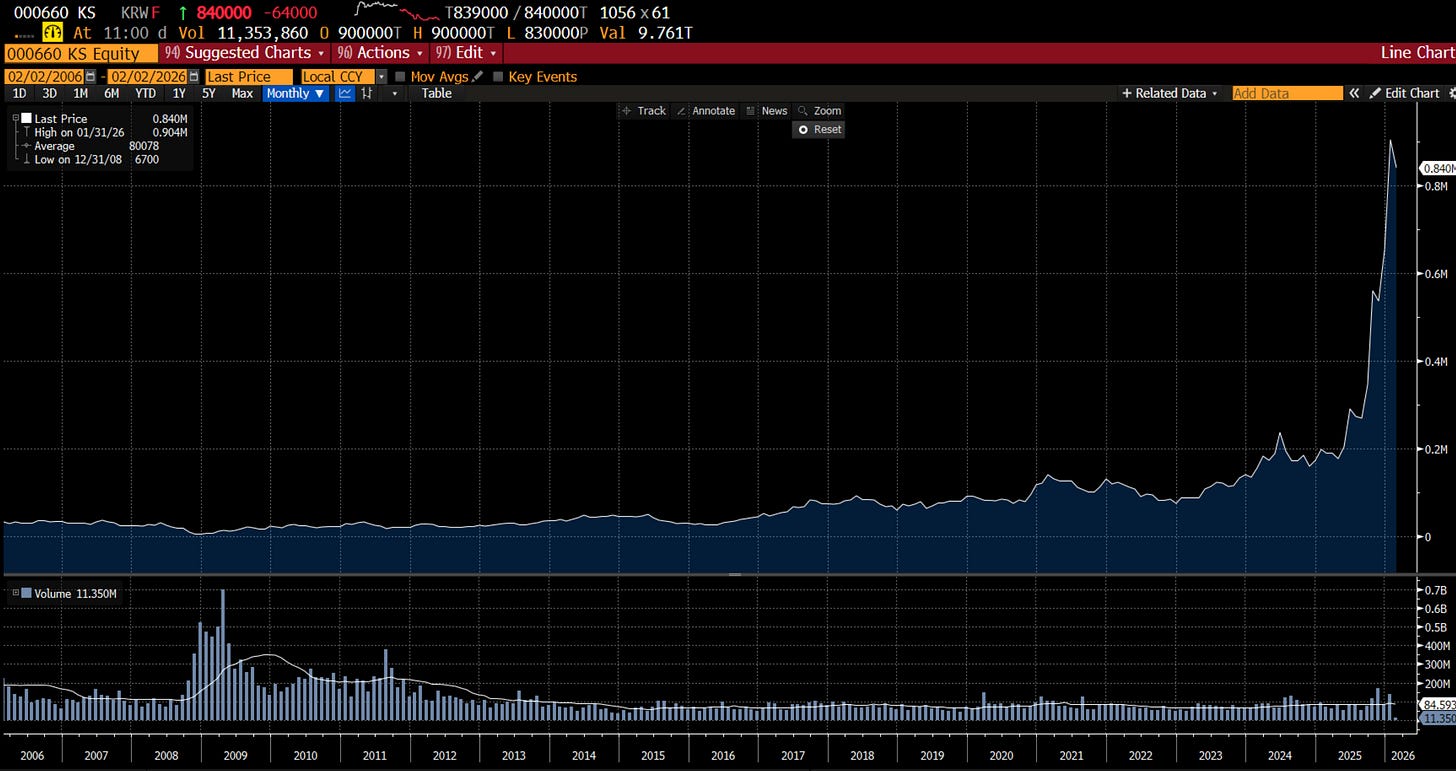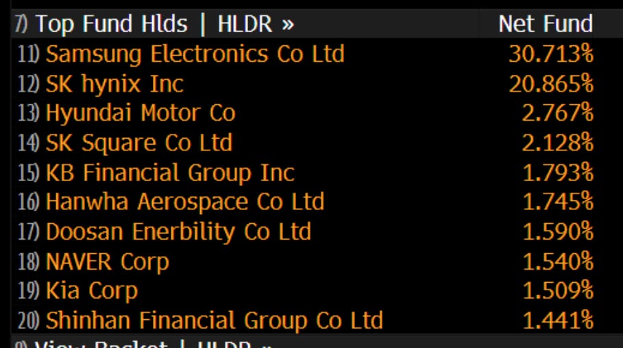 If the market is going up, then why is the KOSPI VIX so high? The most likely answer is autocallables, a product that Koreans love. In the flat equity market and low interest rate environment that has existed since 2010 in Korea, investors have tried to juice returns with autocallables (structured products) that generate a yield by selling volatility. Its a retail product that packages up the premium from selling insurance on the market and turns into “yield” product. I have written about it many times, so please see an old note for more details. It is not hard to find the reason for the Kospi 200 surging. Looking at a Kospi 200 ETF - you can see two stocks make up more than 50% of the index. Samsung Electronics and SK Hynix.