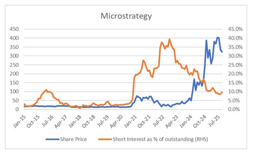 If you are mindlessly bullish, there is no problem here. You would think the market was rewarding the vision of Michael Saylor with a superior market cap, and he took full advantage. Personally, I think its a variation of the CDO trade we saw from the Big Short. Big hedge fund wanted to short CDOs, so CDOs needed to be created to be shorted. Bearishness created its own demand. Investors were bearish on Strategy, so short interest as share of outstanding surged from 2021 to 2024. I do not short popular shorts, because when a hedge fund shorts a stock, it is locking up those shares. They can not be sold, until they are bought back. Bearishness on Strategy, probably drove its premium to NAV, which in turn drove its purchases of Bitcoin - market circularity at its fineness.