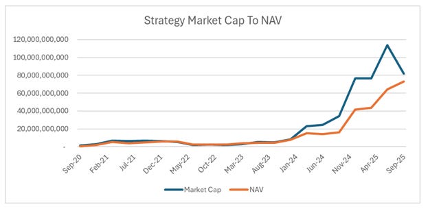 I have been surprised by this surge to be honest. Tether pays no interest, nor does it offer capital appreciation. Why leave your money in Tether when interest rates are not zero? Perhaps its capital controls, or perhaps people leave money in tether when bearish on crypto? I don’t know, but I find it odd. As we can see from gold and silver, people are happy so speculate on zero yielding assets, so what is wrong with Bitcoin? Well I saw an interesting article in the FT postulating that Bitcoin treasury companies like Strategy (aka Microstrategy), were actually incentivise to issue stock to buy Bitcoin, as their market caps traded above NAV. Generally speaking, Strategy Market Capitalisation has been above it NAV, until recently.